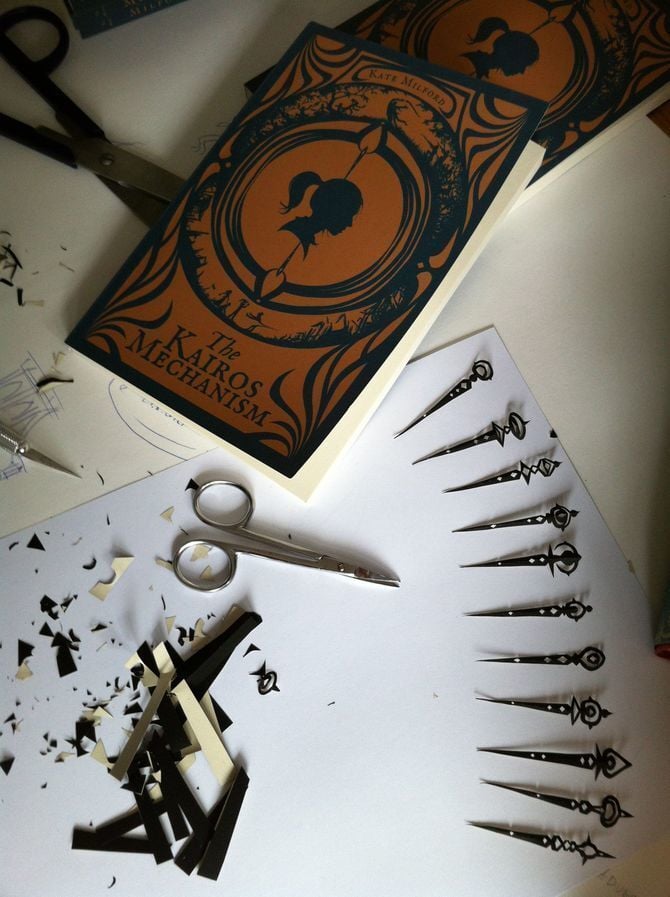 Andrea Offermann created the cover for The Kairos Mechanism beginning with hand-cut silhouette art. I sent 50 copies to Germany for her to autograph for a special edition, and she surprised me with hand-cut pins in the style of the cover for each book. Your copy will be numbered (these are 51-100 of the 300 copy first printing) and signed by both Andrea and myself.